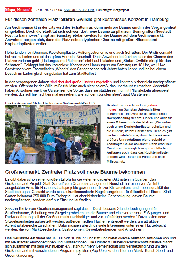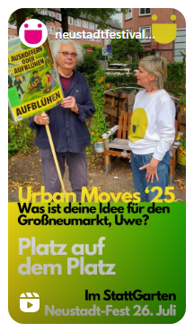 am Di, den 10.Juni um 19h soll in der Stadtteilkonferenz in der Schule Neustädter Str ein Beschluss zum Erhalt der Platzstruktur bei Neugestaltung herbeigeführt werden. Das geht nach hinten los weil es nicht um Neugestaltung sondern um den Erhalt der ! jetzigen Struktur geht, incl Bäume, Schatten und Kopfsteinpflaster. (…)Werden sich die Erben der Gebrüder Button (und Preisträger) äußern?