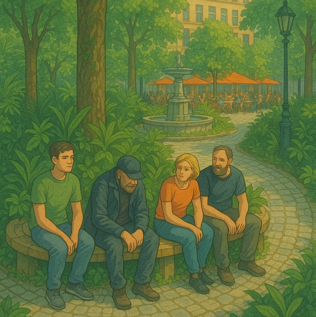 Draw a card – it holds a question about this place. Then speak freely, for one minute or more. What does this square mean to you? Shade or shine, benches or buzz – you decide. Your thoughts matter – and your voice adds to the story of this Platz.