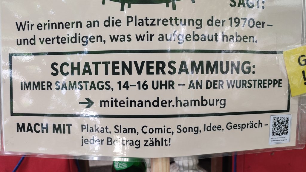 - 22.7., 19h Stadtteilkonferenz HdJ Stintfang, unser das "Demokratie Nadelöhr", Schatten jetzt im Protokoll, "Milieuschutz" Diskussion at Speakers Corner an der Wursttreppe..