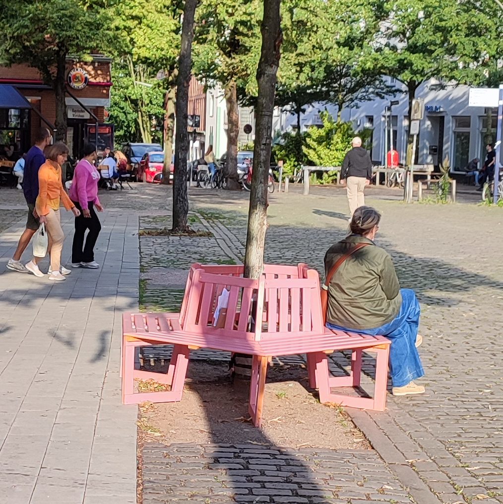 - 28.7., 19.30h, der letzte Sonnenstrahl des Tages liegt auf der rosa Bank des "Baums der Hoffnung". Meine Banknachbarin aus Blankenese berichtet von den rutschigen neuen Glattplatten des umgestalteten Marktplatzes