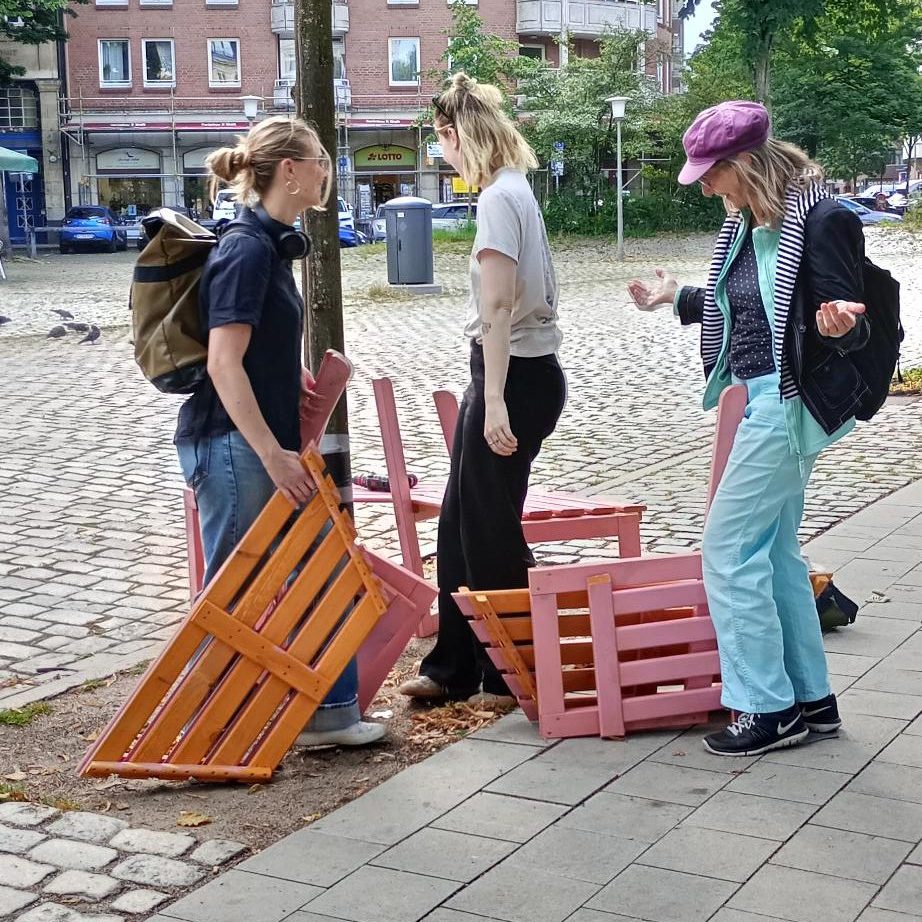 mit und für die Platz Figuren temporäre Sitz-Pflanz- bzw. Unterhaltungsobjekte entwickeln um der drohenden Glattplanung etwas entgegenzusetzen und endlich Sitzgegelenheiten auf der 2-wöchentlichen Markt Wirtschaftsfläche zu schaffen