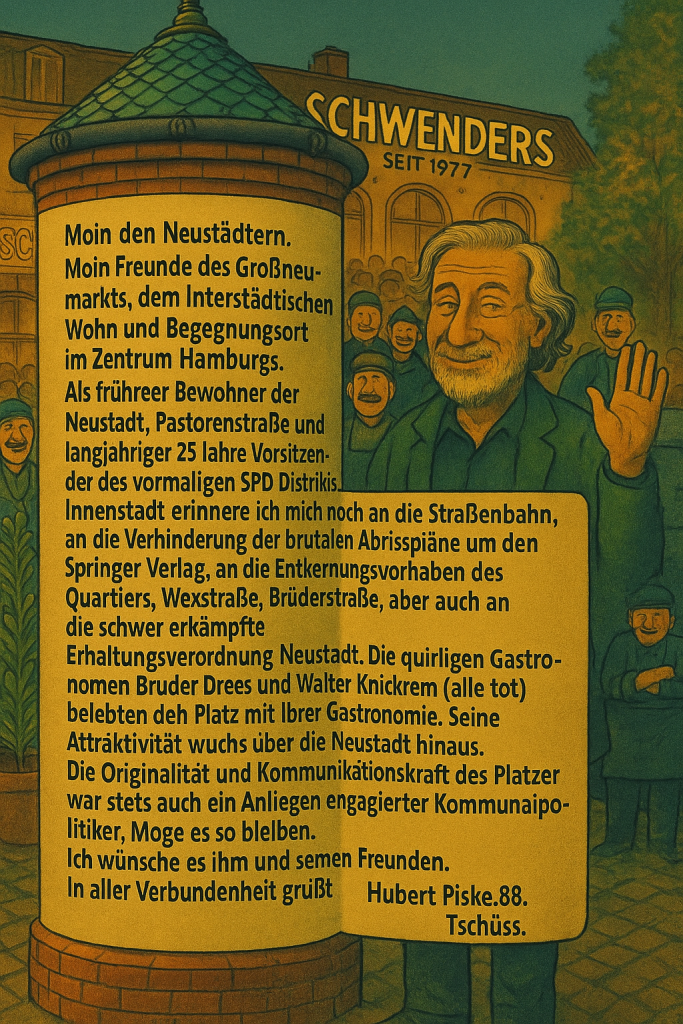 Nach dem Tüdelband und Wache14 kommen zwei die nicht ausrücken sondern einkehren. Zwei Brüder friesisch herb mit Sprache im Gepäck und später: Senf und Sekt dazu. Sie kleben keine Strafzettel – sie kleben Haltung auf die Haube der Geschichte. “Männer, die man ruft“ steht auf dem Button. Ein Spruch für Ordnung. Doch was da ruft, sind bald die Gassen, die Hinterhöfe, die Geschichten im Gemäuer, die nach Abriss schreien – aber nach Rettung rufen. Die Drees-Brüder, erst Texter, dann Tellerträger, dann Tischretter, servierten mit jedem Gang auch ein Viertel zum Mitverdauen. Sie gaben dem Gängeviertel kein neues Pflaster, sondern ließen das alte wieder atmen. Weil man nicht alles auskoffern muss, was eckig, uneben oder unbequem ist. Inklusion beginnt nicht mit Beton, sondern mit Beteiligung. Und während heut wieder geplant wird, den Großneumarkt zu glätten, platt zu machen, den Kanten Komfort beizubringen, ruft etwas aus dem Button von damals: “Wir bleiben.“ Nicht als Mahnmal, nicht als Museum, sondern als Menü. Mit Geschichte als Vorspeise, und Zukunft im Pflanzkübel.