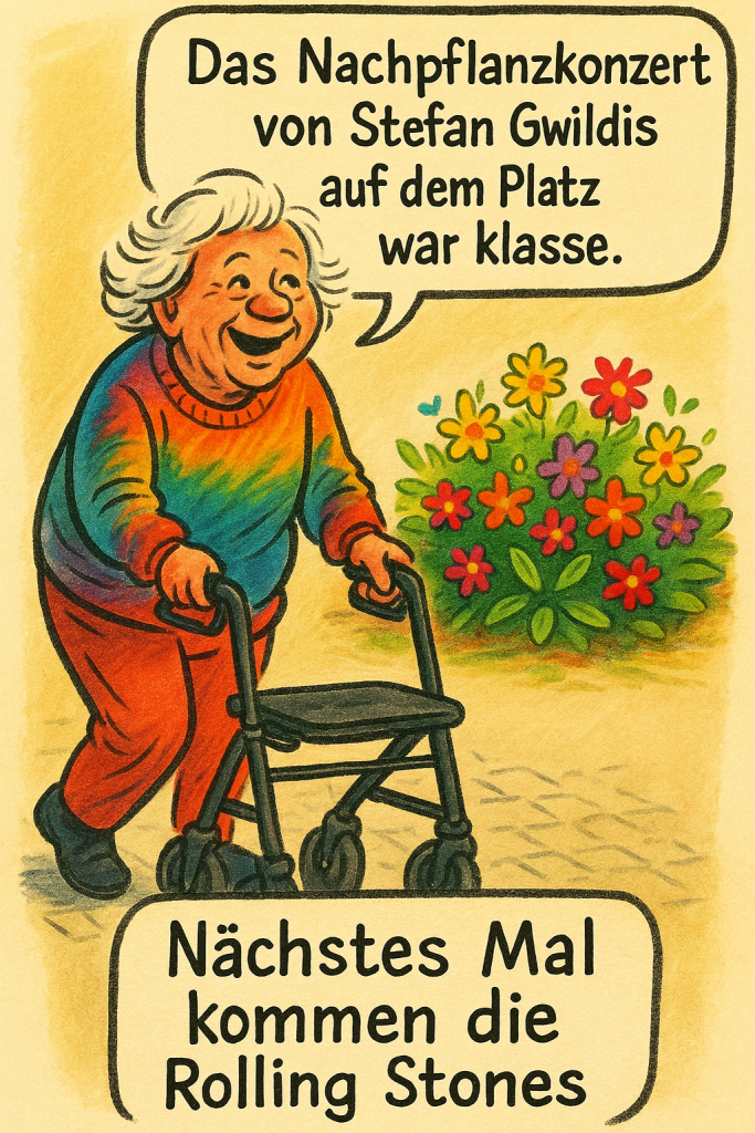 (wütend, anklagend) Enkelgeld für Glattplatten! Wurzeln raus – weil Pflege zu teuer. Schatten weg – weil WLAN besser durchkommt.